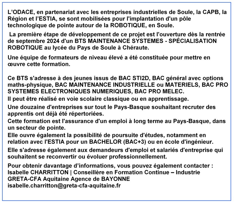 BTS MAINTENANCE SYSTEMES spécialisation robotique au lycée de Chéraute